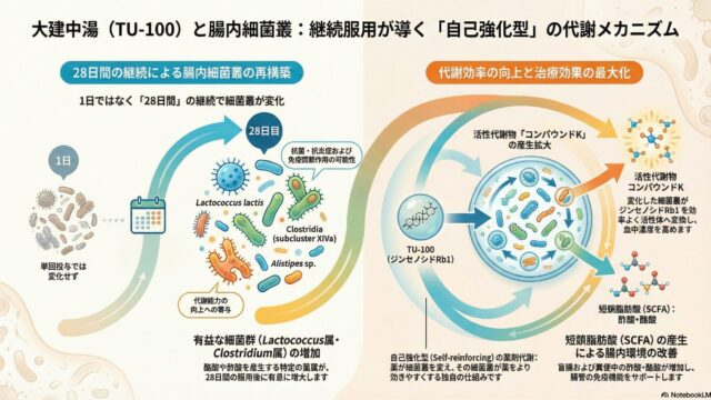 漢方 漢方薬「大建中湯(TU-100)」の真の力:腸内フローラを育てる 漢方薬「大建中湯」の驚くべき効果:継続服用が腸内フローラを育て、自らの薬効を高める仕組み大建中湯(TU-100)は、腹部膨満感や術後のイレウス(腸管麻痺)などの治療に広く処方される代表的な漢方薬です。これまで、腸管の血流や運動を直接刺激する... 2026.03.08 漢方論文