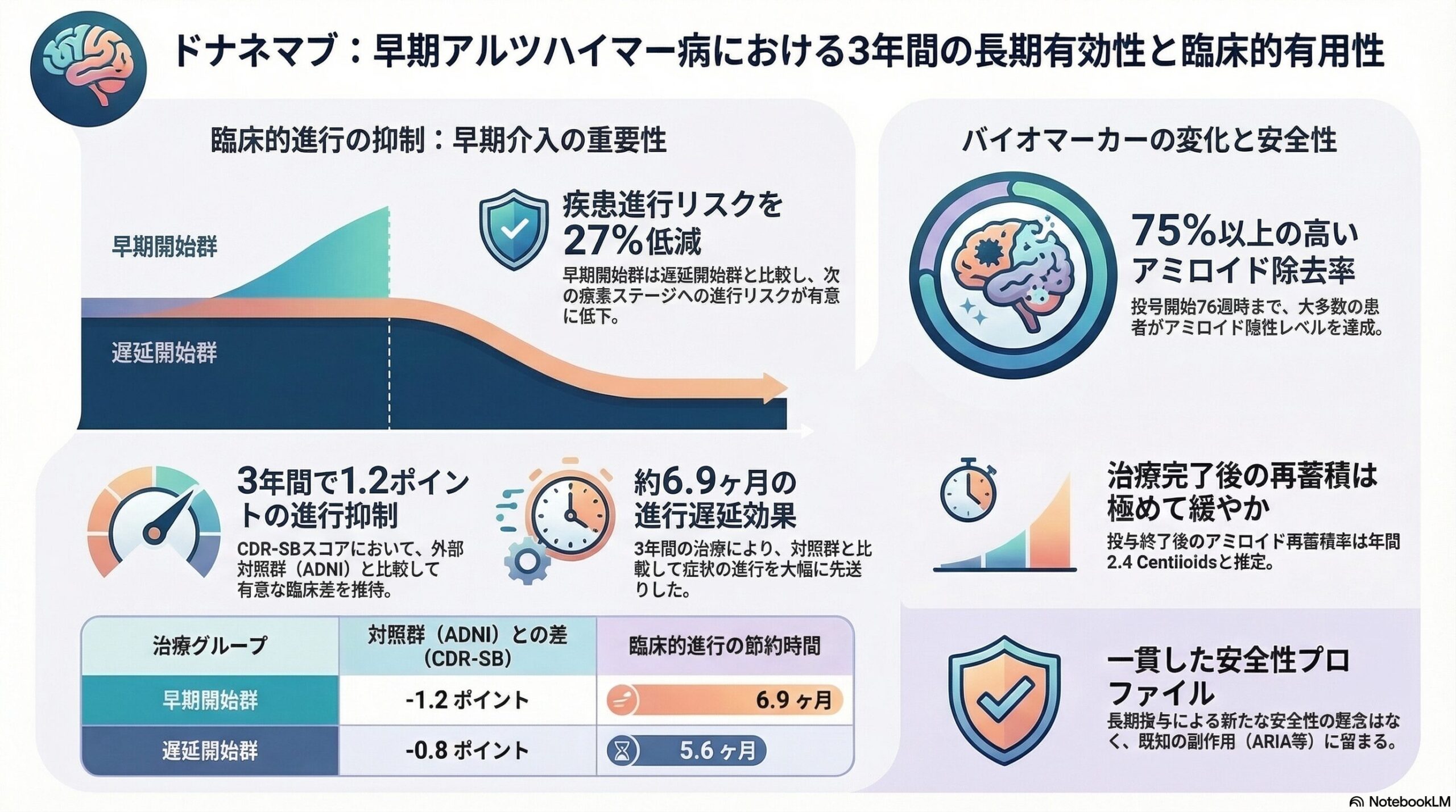 データによると、ドナネマブの投与を開始して76週(約1年半)後には、早期開始グループの76.4%、遅延開始グループの76.5%という非常に高い割合の患者さんで、アミロイド斑が「陰性(クリアランス)」と判定されるレベルまで減少しました。病気の進行度合い(治療開始時期)にかかわらず、薬によるアミロイド斑の除去効果は同等に高いことが示されています。